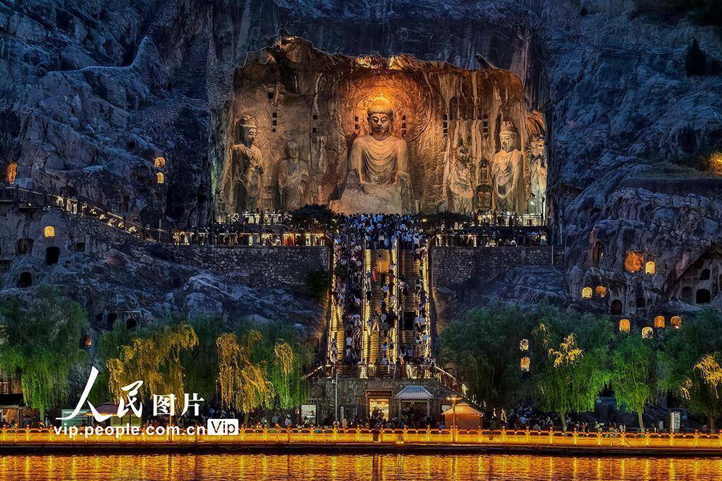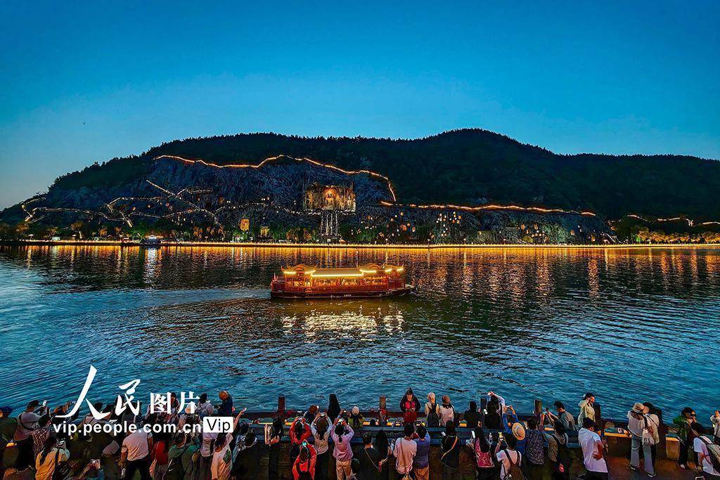 2026年4月17日晚,河南洛阳,游客在龙门石窟游玩,感受精美绝伦的石刻艺术。李卫超摄(人民图片网)